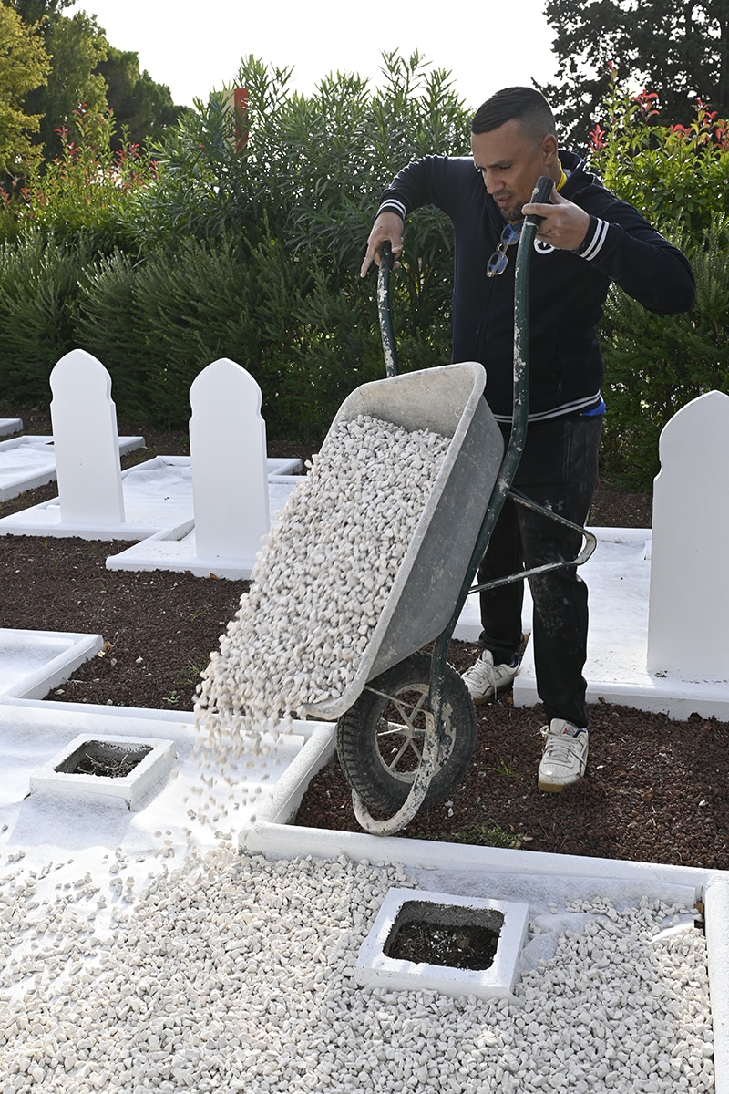 Brouettes, outils et seaux à la main, on s’activait ce vendredi 3 octobre dans le carré militaire du cimetière Saint-Gérard. Objectif : finaliser la rénovation de ce lieu d’hommage, de respect et de mémoire. Une première étape avait été réalisée avec la mise en peinture des bordures et croix des 96 sépultures par les membres du Souvenir Français en juin dernier. Aujourd’hui, il s’agissait d’enlever le tout-venant et de le remplacer par 15 tonnes de gravier blanc et assurer également un désherbage.